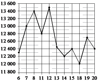 На рисунке жирными точками показана цена никеля на момент закрытия биржевых торгов во все рабочие дни с 6 по 20 мая 2009 года. По горизонтали указаны числа месяца, по вертикали—цена никеля в долларах СШАза тонну. Для наглядности жирные точки на рисунке соединены линией.; ; ; ; ; ; Определите по рисунку наименьшую цену никеля на момент закрытия торгов в период с 7 по 15 мая включительно. Ответ дайте в долларах США за тонну.;