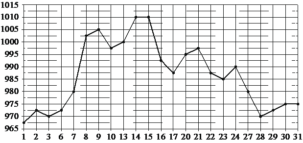 На рисунке жирными точками показана цена золота, установленная Центробанком РФ во все рабочие дни в октябре 2009 года. По горизонтали указываются числа месяца, по вертикали цена золота в рублях за грамм. Для наглядности жирные точки на рисунке соединены линией.