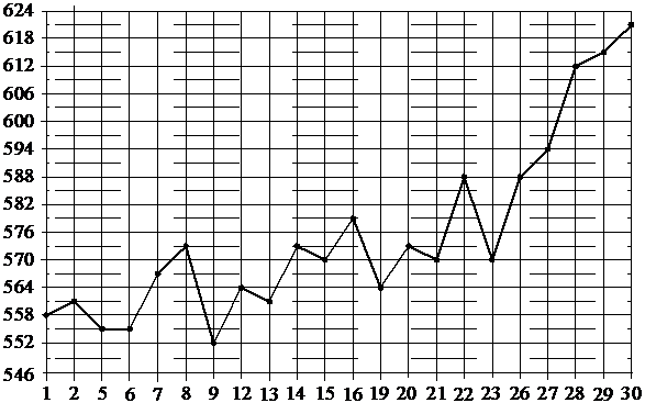 На рисунке жирными точками показана цена палладия, установленная Центробанком РФ во все рабочие дни в октябре 2010 года. По горизонтали указаны числа месяца, по вертикали цена палладия в рублях за грамм. Для наглядности жирные точки на рисунке соединены линией.