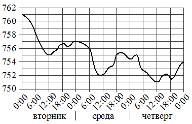 На рисунке показано изменение атмосферного давления в течение трёх суток. По горизонтали указаны дни недели и время, по вертикали значения атмосферного давления в миллиметрах ртутного столба.