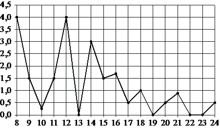 На рисунке жирными точками показано суточное количество осадков, выпадавших в Томске с 8 по 24 января 2005 года. По горизонтали указаны числа месяца, по вертикали—количество осадков, выпавшихв соответствующий день, в миллиметрах. Для наглядности жирные точкина рисунке соединены линиями.; ; ; ; Определите по рисунку наибольшее суточное количество осадков в Томске за данный период. Ответ дайте в миллиметрах.;