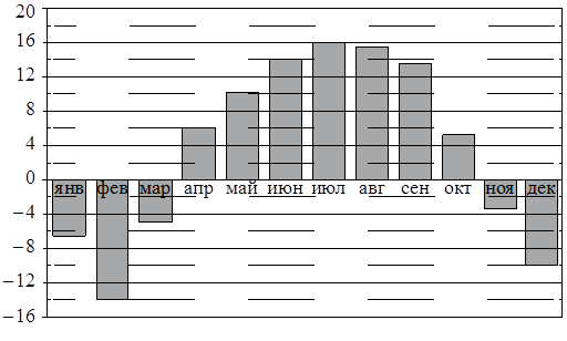 На диаграмме показана среднемесячная температура воздуха в Нижнем Новгороде за каждый месяц 1994 года. По горизонтали указываются месяцы, по вертикали — температура в градусах Цельсия.