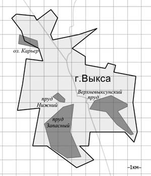 | На фрагменте географической карты схематично изображены границы города Выксы и очертания водоёмов (длина стороны квадратной клетки равна 1 км). Оцените приближённо площадь озера Карьер. Ответ дайте |
