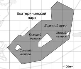 | На фрагменте географической карты схематично изображены очертания Большого пруда Екатерининского парка с островами (площадь одной клетки равна одному гектару). Оцените приближённо площадь Большого острова. Ответ дайте в гектарах с округлением до целого числа. |