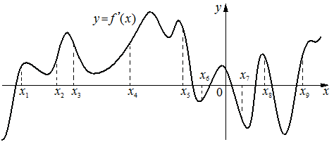 На рисунке изображён графикy=f'x— производной функцииfx.На оси абсцисс отмечено девять точек:x1,x2,x3,x4,x5,x6,x7,x8,x9.Сколько из этих точек принадлежит промежуткам убывания функцииfx?; ;