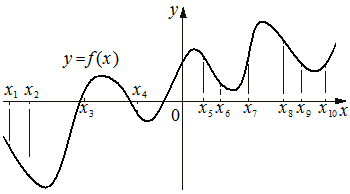 На рисунке изображён график функцииy=f(x). На оси абсцисс отмечено десять точек:x1,x2,x3,x4,x5,x6,x7,x8,x9,x10.В ответе укажите количество точек (из отмеченных), в которых производная функцииf(x)отрицательна.;
