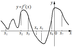 На рисунке изображён графикy=f'(x)—производной функцииf(x).На оси абсцисс отмечено семь точек:x1,x2,x3,x4,x5,x6,x7.Сколько из этих точек принадлежит промежуткам убывания функцииf(x)?;