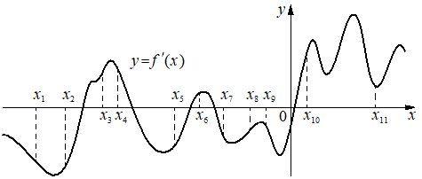 На рисунке изображён графикy=f'(x)—производной функцииf(x).На оси абсцисс отмечено одиннадцать точек:x1,x2,x3,x4,x5,x6,x7,x8,x9,x10,x11. Сколько из этих точек принадлежит промежуткам убывания функцииf(x)?; ;