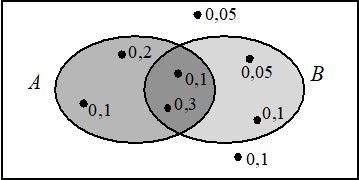 На рисунке изображена диаграмма Эйлера для случайных событийивнекотором случайном опыте. Точками показаны все элементарные события иоколо каждого указана его вероятность. Найдите вероятность события.;
